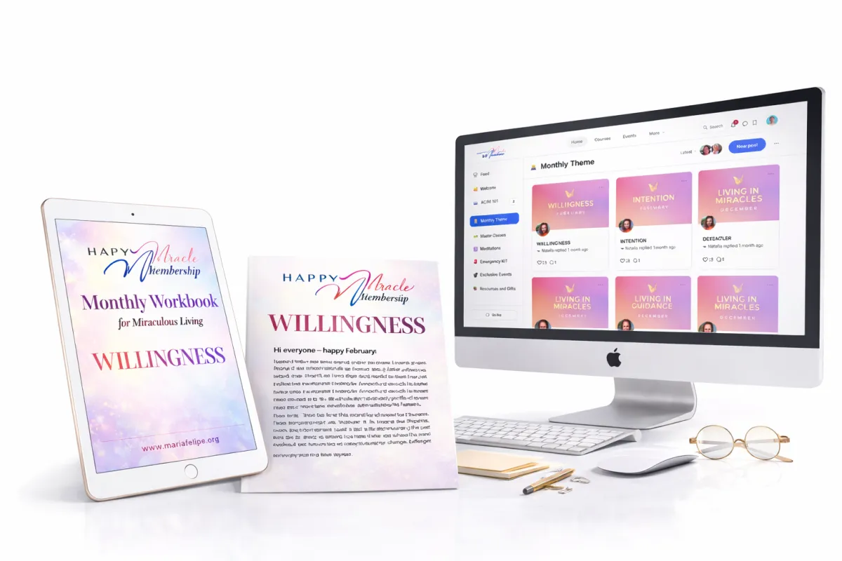Each month, you receive a guided workbook centered on one transformational theme to help you shift your perception and create real inner change. Inspired by A Course in Miracles and supported by teachings from Byron Katie, Joe Dispenza, Eckhart Tolle, and more, everything is simplified for real-life application. Inside, you’ll find powerful weekly practices to help you live the theme and integrate the teachings into your everyday life. This isn’t just a workbook — it’s your monthly reset, your perception shift, and your transformation companion.