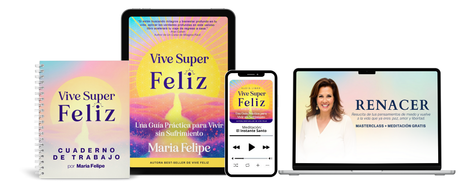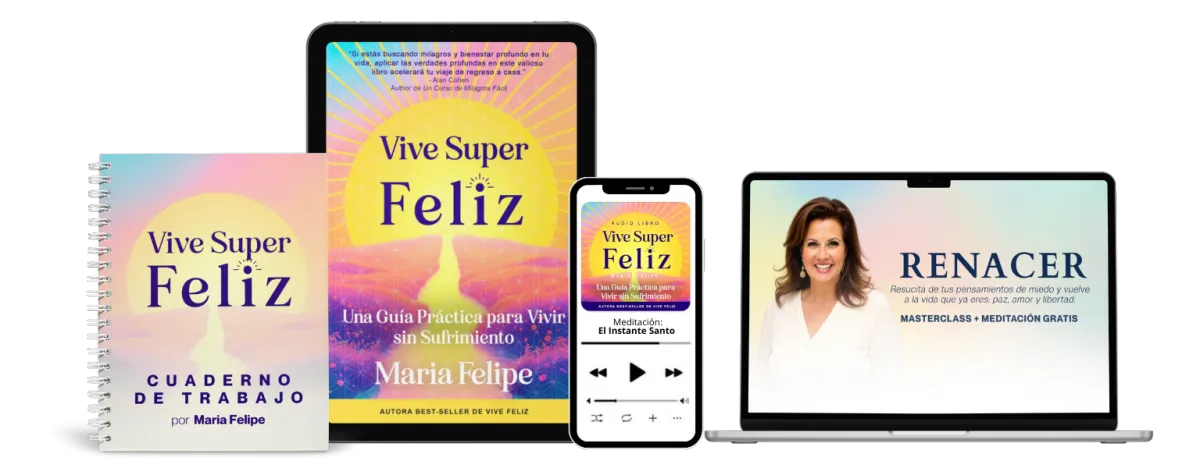 Es una experiencia digital completa creada por María Felipe para ayudarte a soltar el sufrimiento y vivir en paz. Incluye el eBook Vive Súper Feliz, una meditación guiada, un cuaderno de trabajo y una masterclass exclusiva — todo accesible desde tu teléfono o computadora.